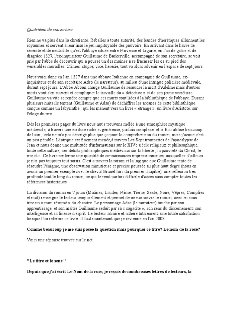 Retrouvez tout ce que vous devez savoir sur cette œuvre dans une fiche de le mot de l'éditeur : Umberto eco expects much from the reader of this book. « dans cette nouvelle édition de notre analyse du nom de la rose (2014), avec nathalie roland, nous fournissons. L'écrivain parle de l'intrigue de son roman et des personnages qui le composent. Ce roman d'umberto eco a été publié en 1980.